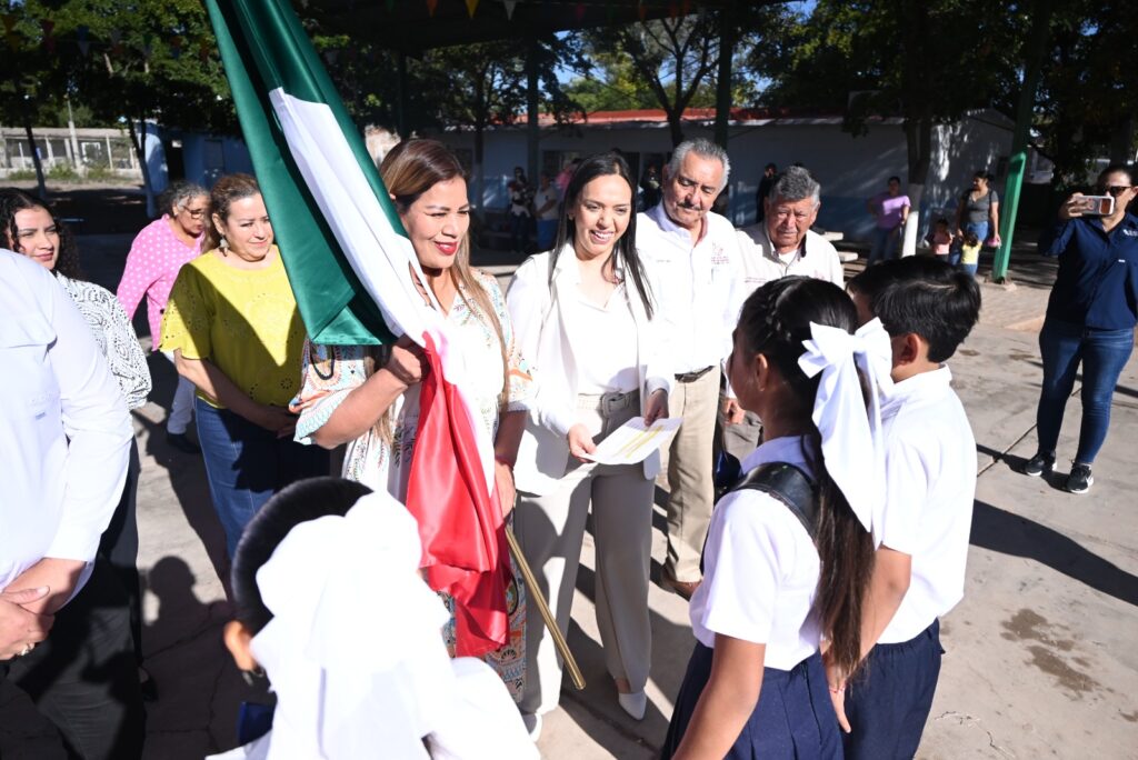 Juan José Ríos, Sinaloa, a 18 de marzo de 2026.– En conmemoración del Día de la Expropiación Petrolera, la alcaldesa Evangelina Llanes Carreón asistió al acto cívico realizado en lau comunidad de El Treinta y Ochito, en la Escuela Primaria Lázaro Cárdenas donde además hizo la donación de una bandera nacional y asta de bandera a la institución educativa.