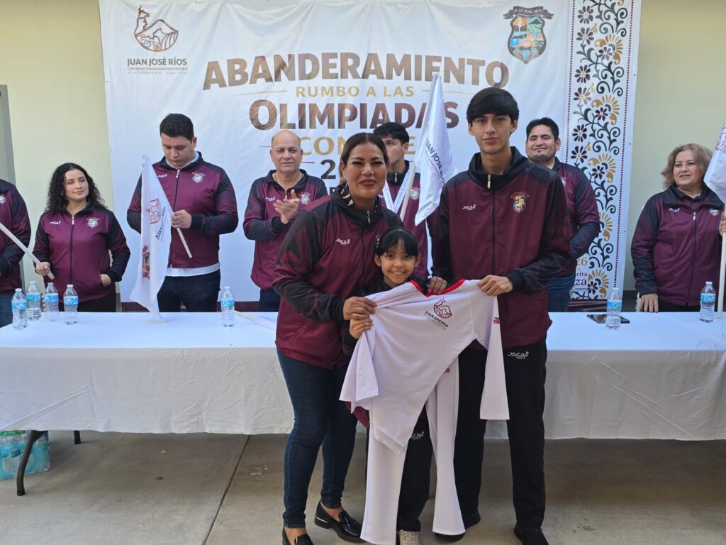 Juan José Ríos, Sinaloa a 05 de febrero de 2026.- En un emotivo y energético evento, la alcaldesa Evangelina Llanes Carreón y autoridades municipales abanderaron a las y los grandes deportistas que participarán en las Olimpiadas CONADE 2026 Fase Estatal.