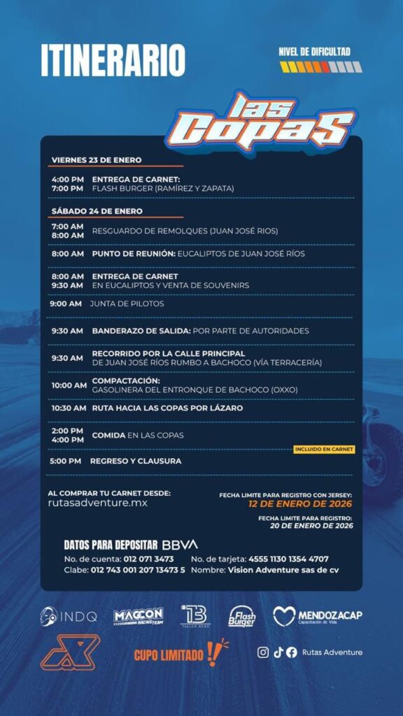Por su parte, se estima la participación de alrededor de 50 vehículos, resaltando que, todas y todos estan invitados a participar. Se recorrerá aproximadamente 150 kilometros de belleza natural y caminos únicos que forman parte de la comunidad, iniciando en los Ecualiptos y concluyendo en Las Copas.