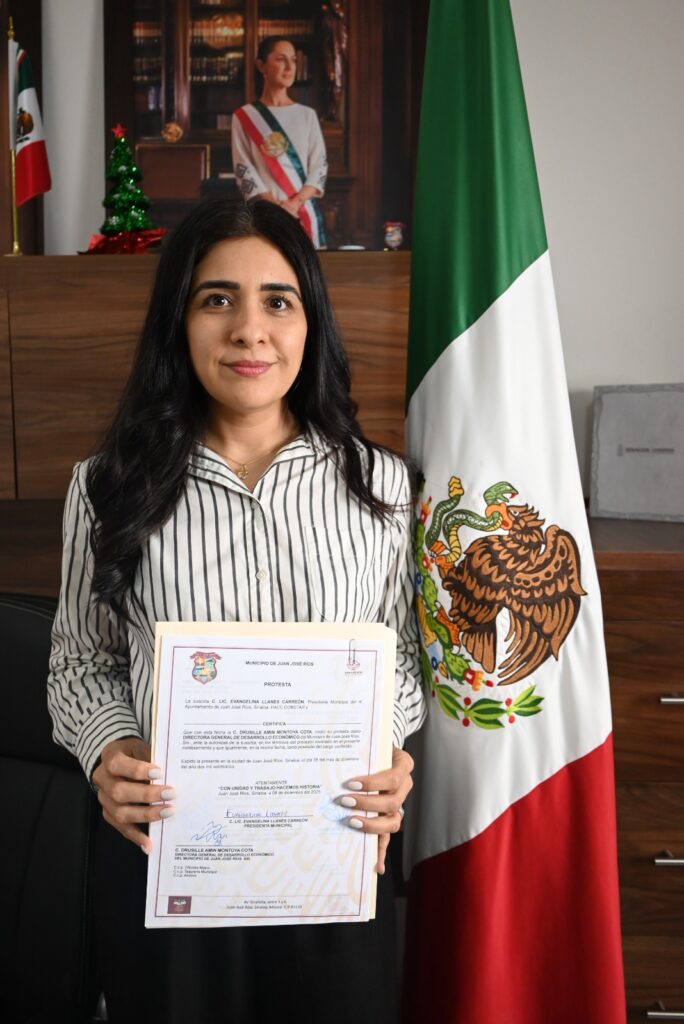 Juan José Ríos, Sinaloa a 14 de enero de 2026.- La alcaldesa Evangelina Llanes Carreón tomó protesta a Drusille Amin Montoya Cota como nueva titular de la Dirección General de Desarrollo Económico Municipal.